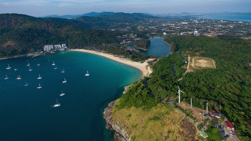 смотровую Ветряк с ветрогенератором на склоне холма и видом на бухту Най Харн и остров Мун